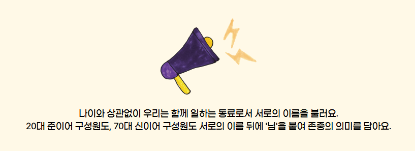 그 이유는, 우리 청년 구성원들이 여기에 ‘일’을 하러 왔지, 어르신들의 서포터가 되려고 입사한게 아니기 때문이에요. 즉 조직 안에서는 서로를 생각하고, 존중하는 행동만이 가능하다는 것을 계속해서 의식적으로 이야기 하고 있어요.