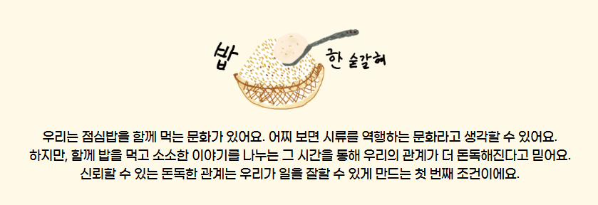 저희의 두 번째 정체성은 ‘식구’예요. 여러분이 생각하시는 식구는 어떤 모습인가요? 사람마다 생각이 다르겠지만 저희는 함께 밥을 나누어 먹는 사이가 식구가 아닐까 생각했어요. 그래서 아립앤위립에는 매일 점심 식사를 함께 하는 조직 문화가 있답니다. 세대가 다르다 보니 당연히 서로의 관심사가 다를 수 있는데요. 식사를 함께하며 대화를 나누다 보면 어느샌가 작은 지점에서부터 공감이 형성되고, 함께 이야기를 하는 것이 즐거워지죠. 이런 과정을 통해 구성원들 간에 관계가 만들어지고, 동료로서 신뢰를 쌓아가는 시간들이 만들어진답니다. (그리고 점심 식사를 함께 하는 대신, 모든 중식비는 회사가 지원하고 있어요!)